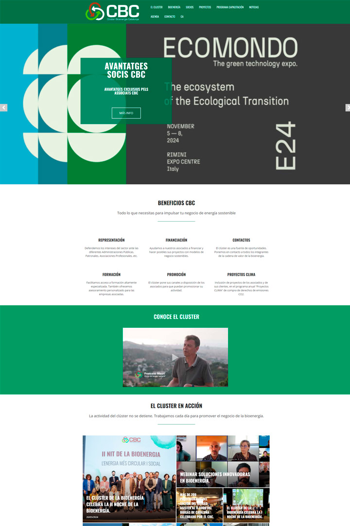 Diseñamos la página web del Cluster Bioenergia de Catalunya (CBC) para comunicar de forma clara y visual los beneficios que ofrece a empresas del sector de la bioenergía. La estructura fue planeada en secciones clave: beneficios para los socios, información del clúster y actividades destacadas, utilizando una paleta verde para reflejar el compromiso con la sostenibilidad. El proceso de creación incluyó definir una navegación intuitiva y accesible, con un diseño en bloques visuales para facilitar la lectura y destacar eventos importantes como Ecomondo 2024. Cada elemento fue cuidadosamente colocado para que los socios accedan fácilmente a recursos como financiamiento, formación y contactos, y añadimos secciones multimedia para dar vida a la misión del CBC.